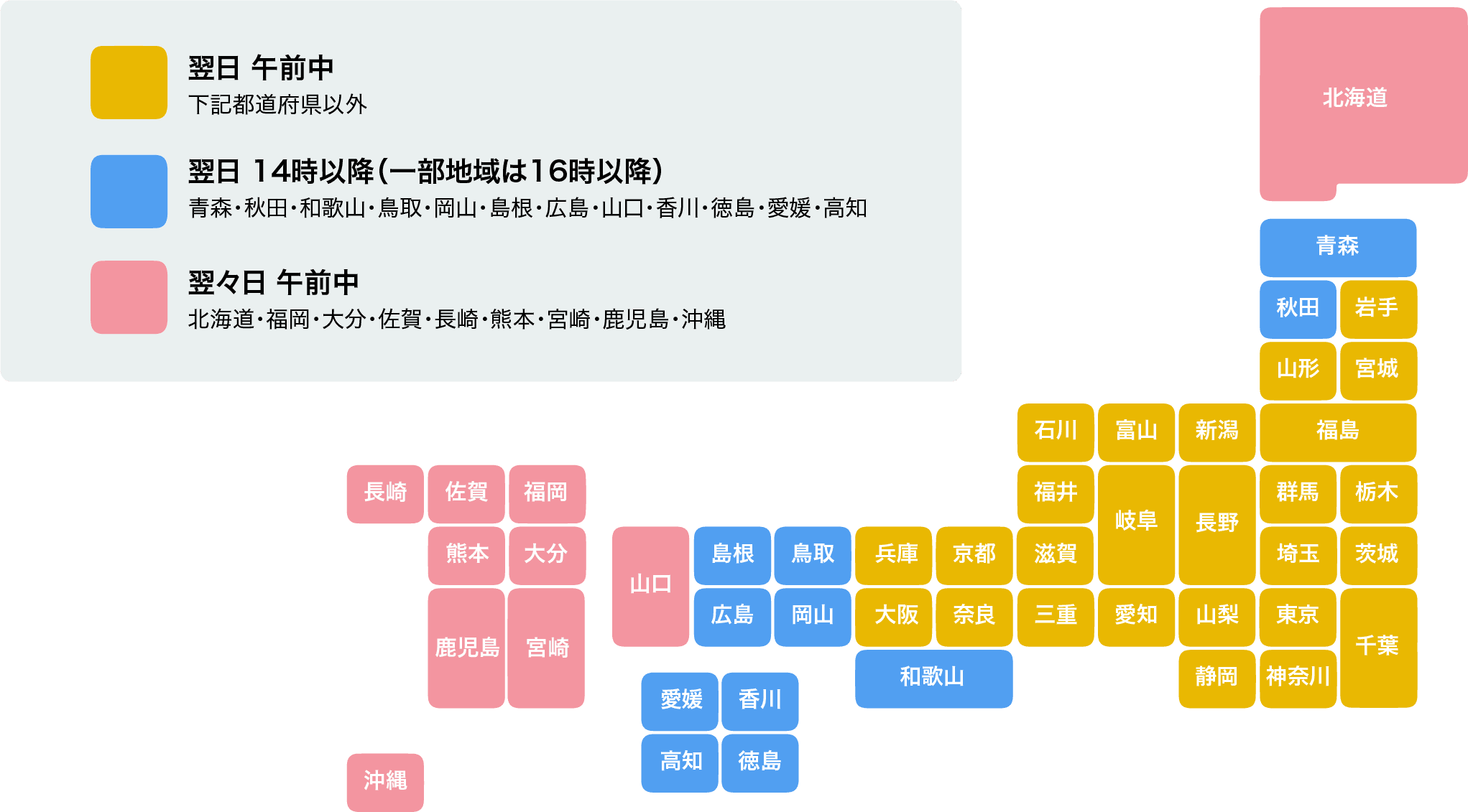離島部や一部地域は、最短のお届け日が上記の地図と異なる場合がございます。