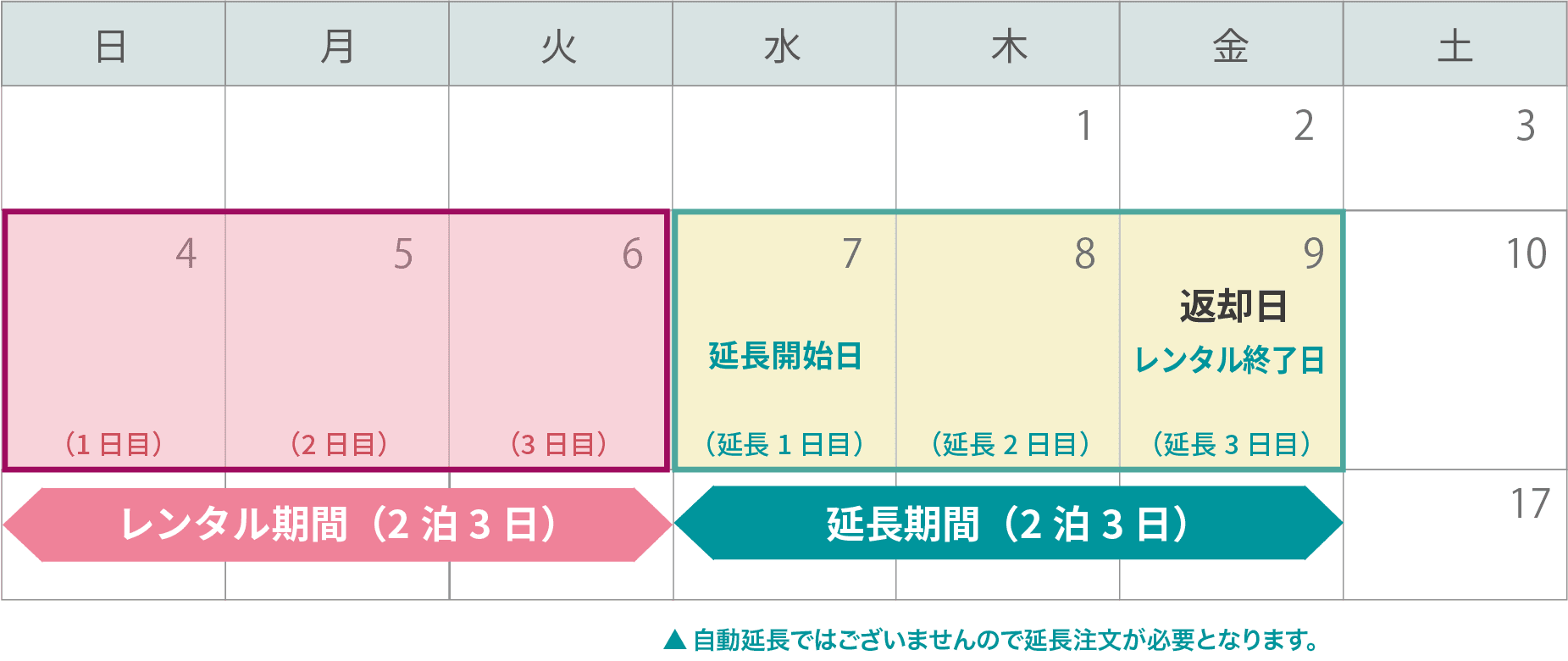 例:元のレンタル期間 4日~6日 9日まで延長したい場合