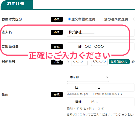 オフィスで受け取りをご希望の場合、お届け先入力欄に、会社住所と会社名や部署名、お受取り人様名を正確にご入力ください。