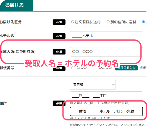 お届け先の名前欄は、ホテルの予約名と一致するようにご記入ください。