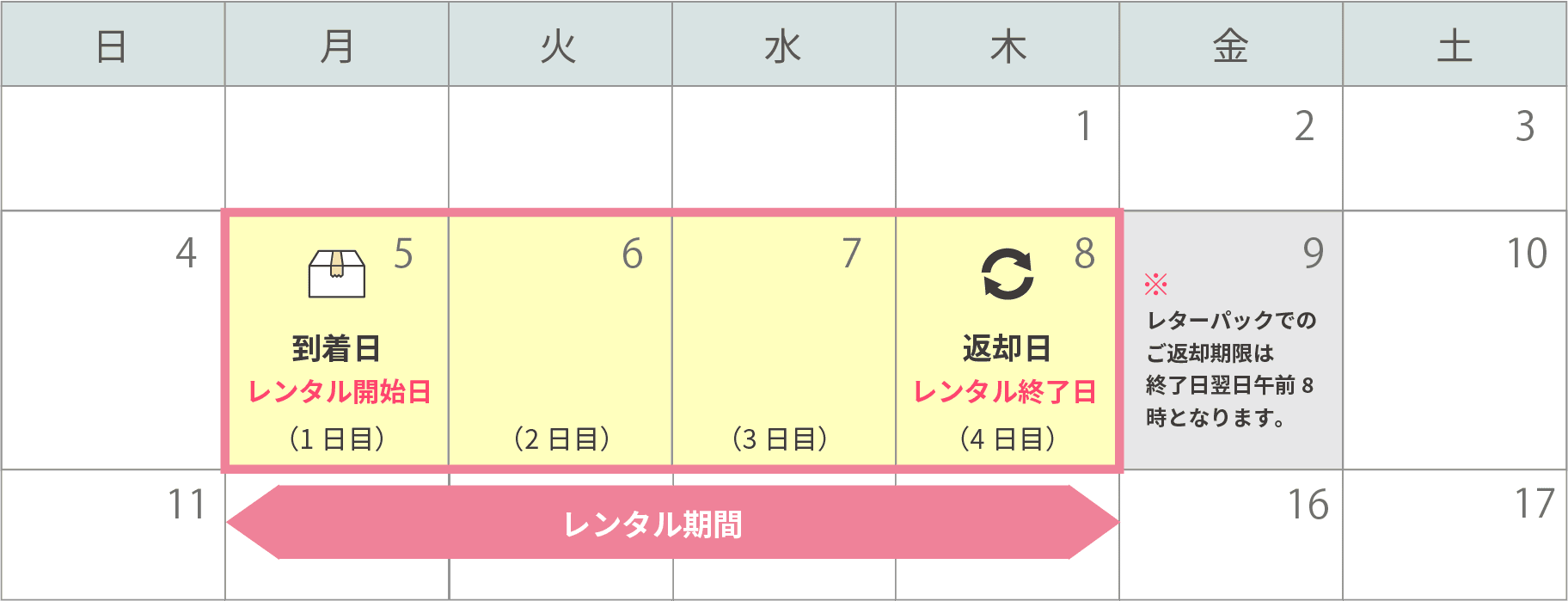 レンタル期間は、「商品が到着した日」から「商品を返却した日(お客様のお手元を離れた日)」です