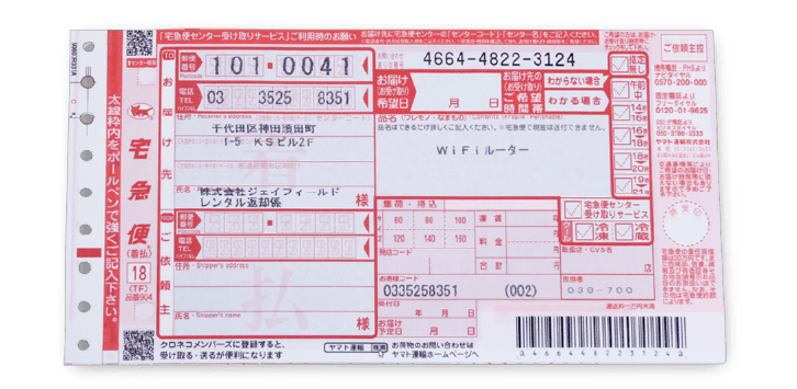 クロネコヤマト着払い伝票は、レンタル商品と一緒にお届けいたします。
